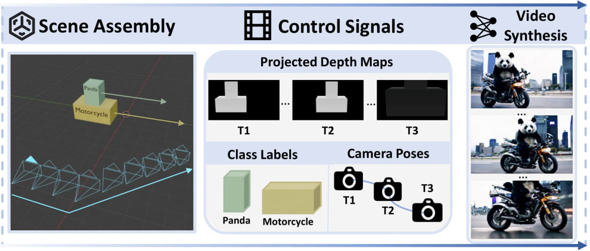 Control Signal Generation: The control signals generated in the first stage (including depth maps, camera trajectories, and object category labels) are fed into the text-to-video diffusion model to guide the generation of video content that meets user requirements.