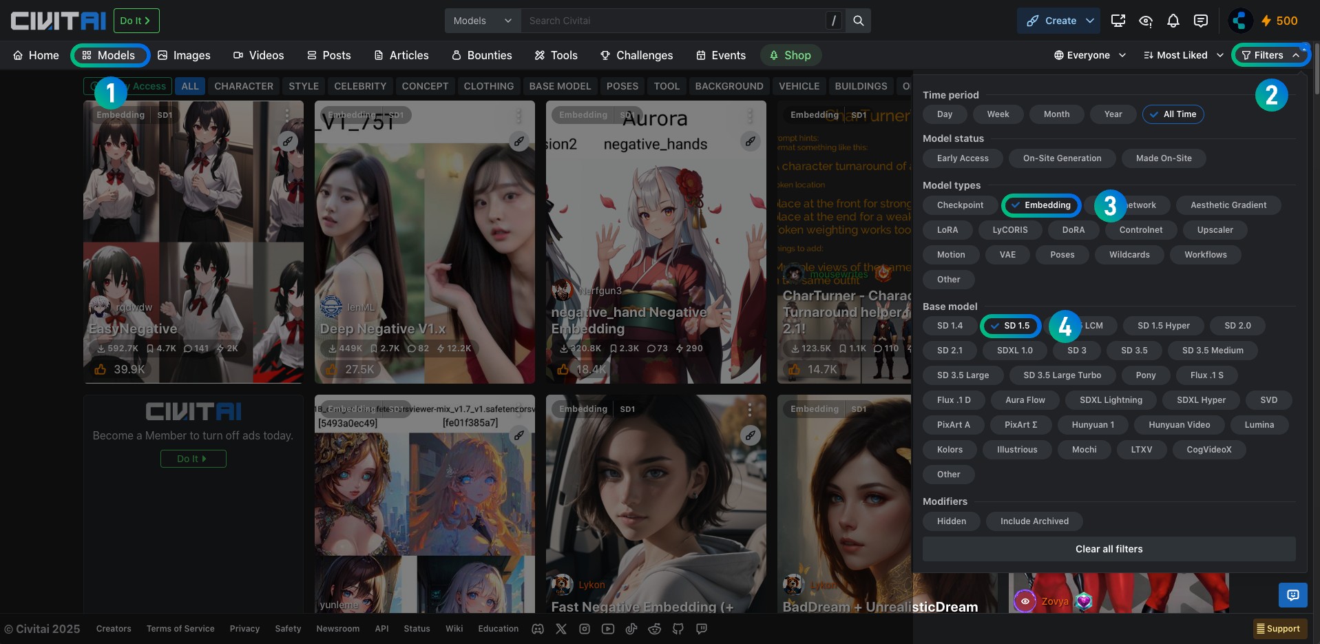 These are common websites where you can download embedding models. Usually, on the corresponding model pages, use the filter to select embedding or Textual Inversion to filter out the corresponding models.